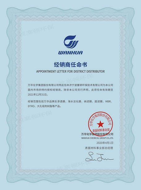 鑒于濟寧波塞頓環(huán)保技術有限公司卓越的水處理技術服務能力,經(jīng)過嚴格的考察與考核后,萬華化學特授權濟寧波塞頓環(huán)保技術有限公司為萬華化學膜產(chǎn)品的經(jīng)銷商。
